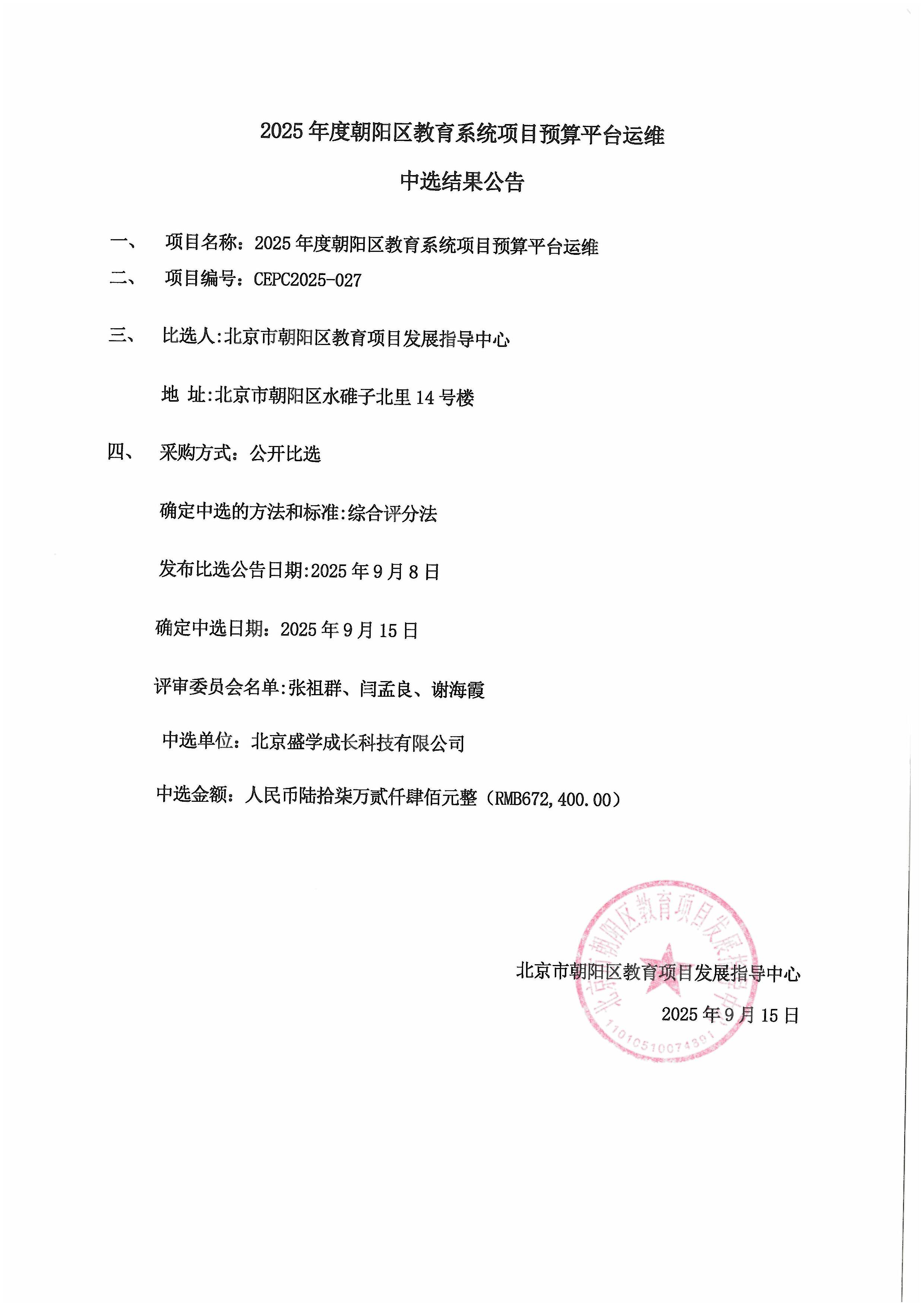2025年度朝阳区教育系统项目预算平台运维中选结果公告