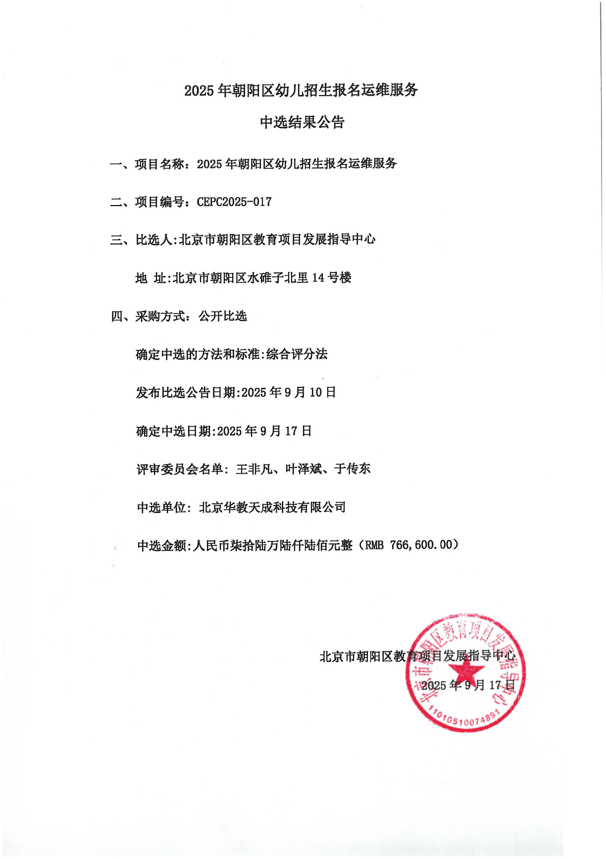 2025年朝阳区幼儿招生报名运维服务中选结果公告