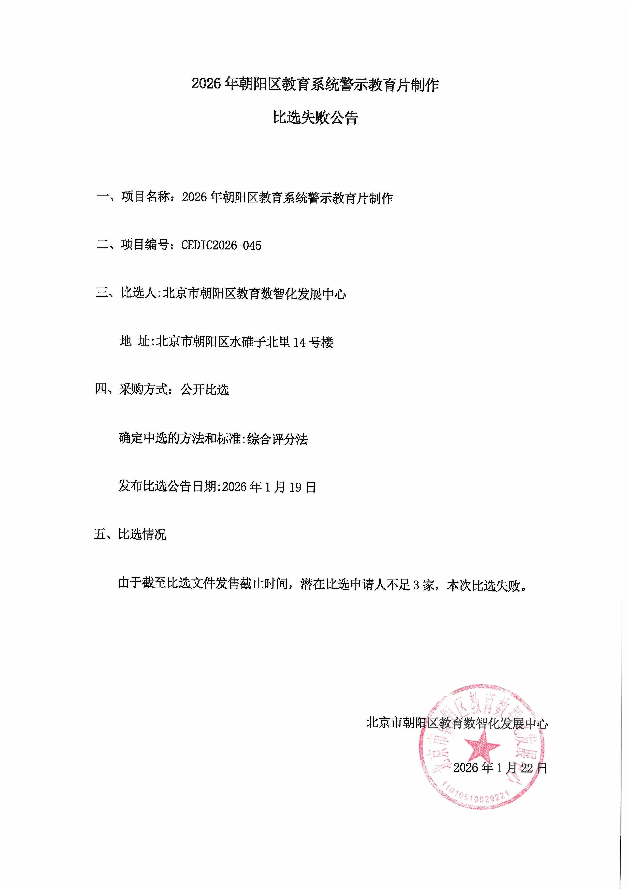 2026年朝阳区教育系统警示教育片制作比选失败公告