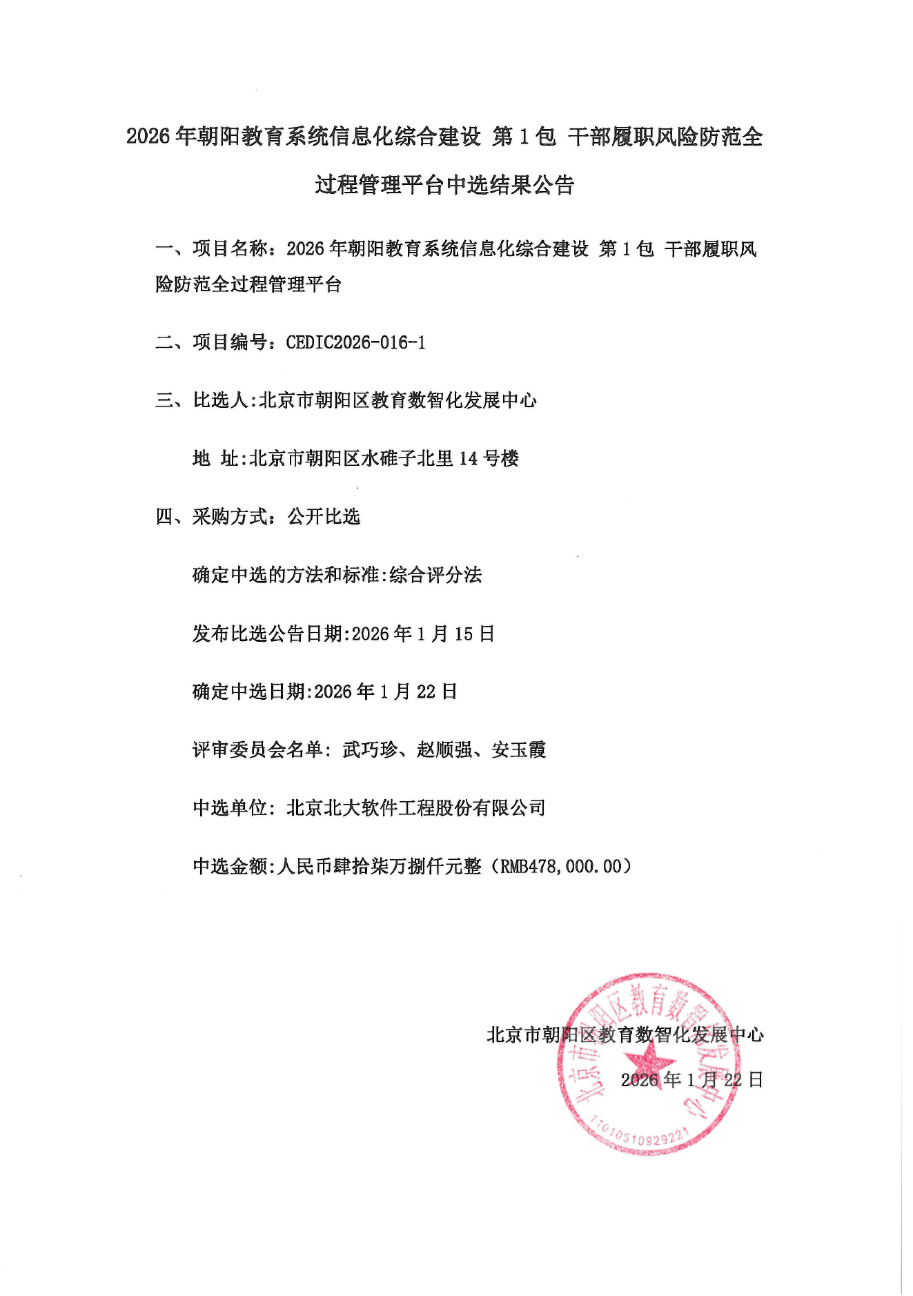 2026年朝阳教育系统信息化综合建设第1包干部履职风险防范全过程管理平台中选结果公告
