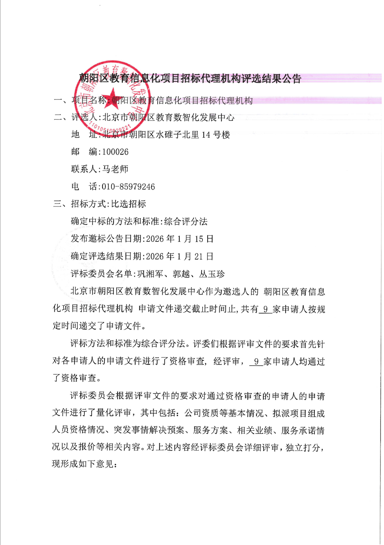 朝阳区教育信息化项目招标代理机构评选结果公告