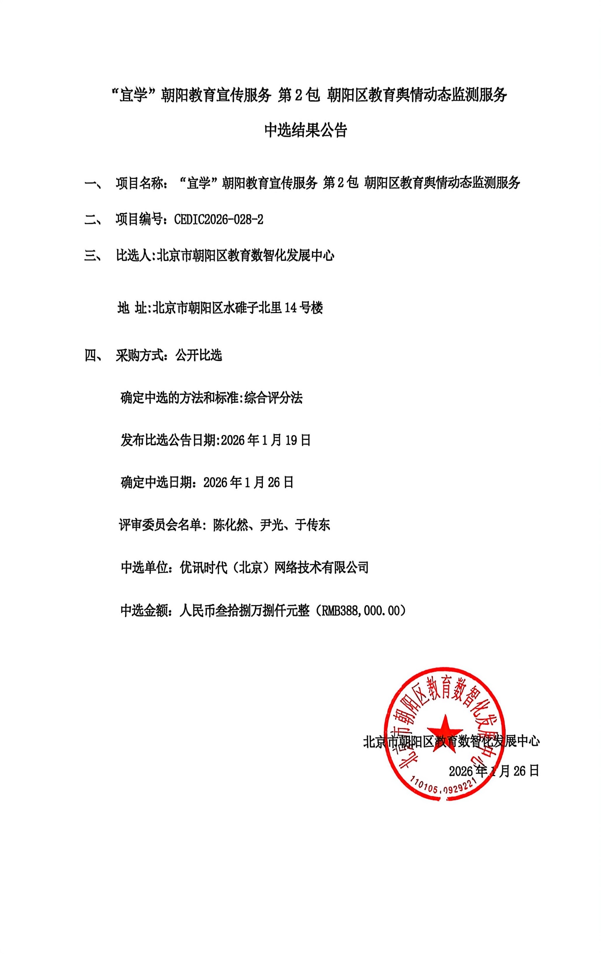 "宜学"朝阳教育宣传服务第2包朝阳区教育舆情动态监测服务中选结果公告