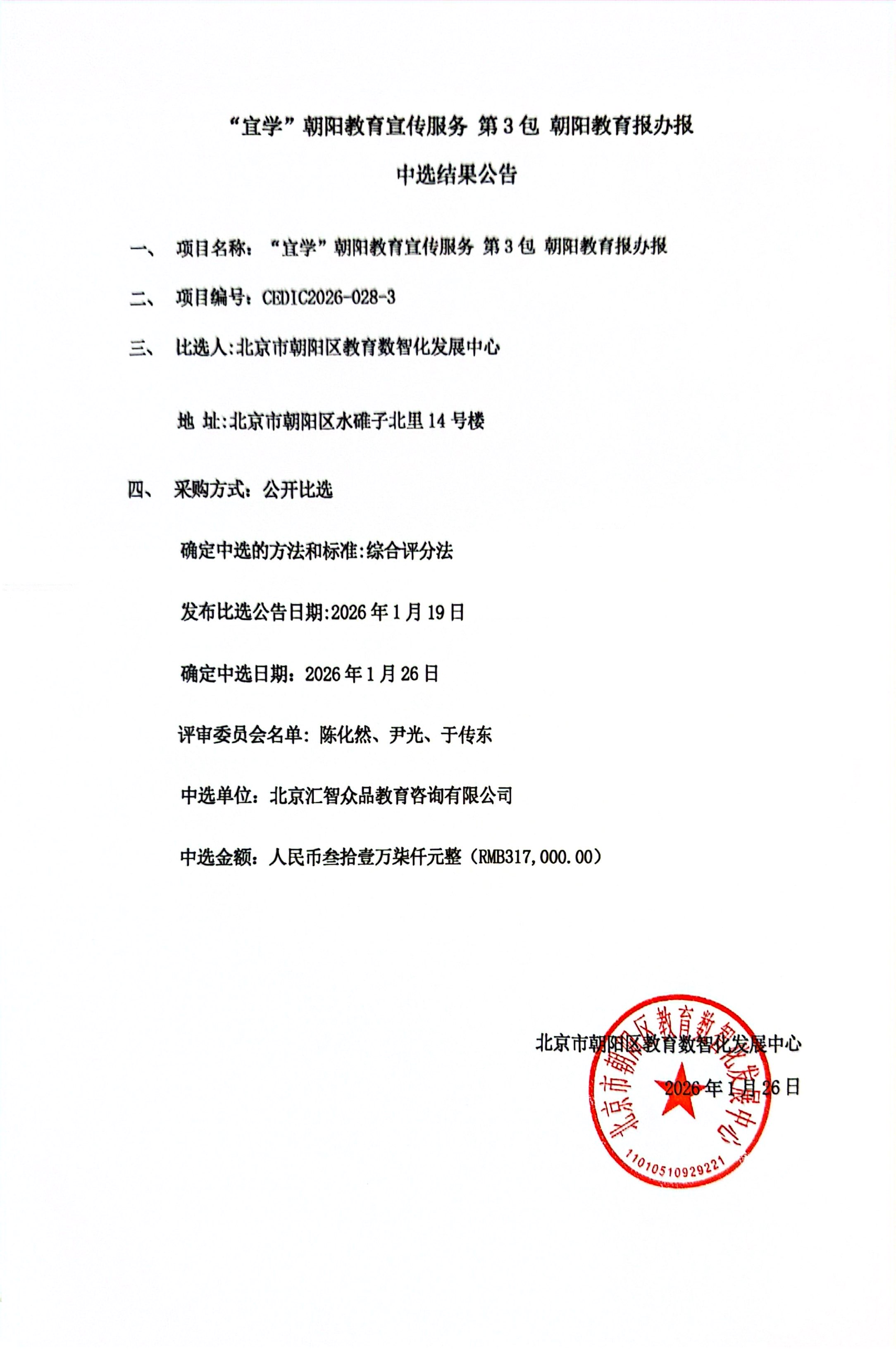 "宜学"朝阳教育宣传服务第3包朝阳教育报办报中选结果公告