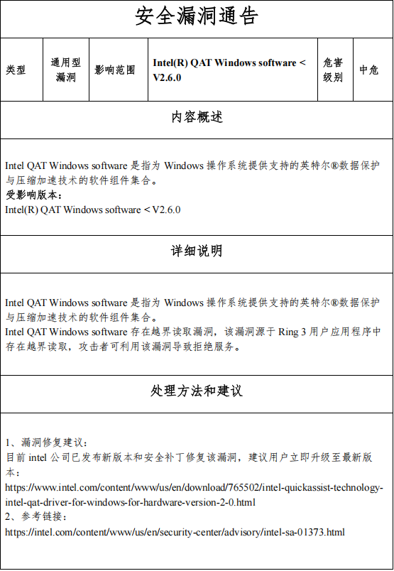【漏洞通告】Intel QAT Windows software越界读取漏洞(CVE-2025-31937)通告