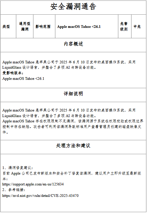 【漏洞通告】Apple macOS Tahoe权限限制不足漏洞(CNVD-2025-31145)通告
