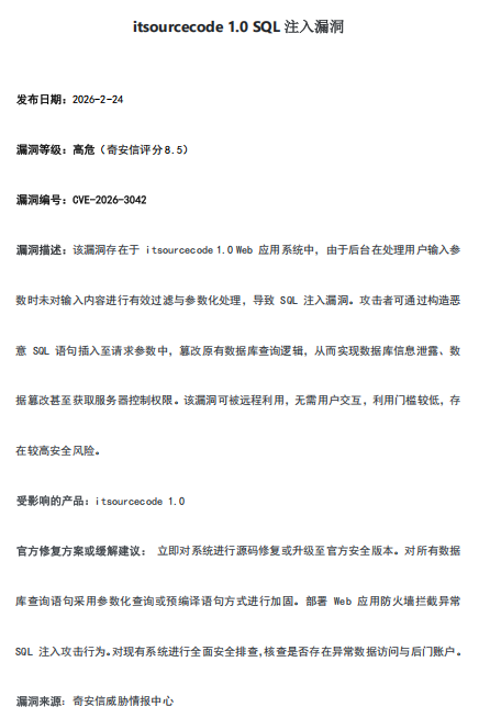 【漏洞通告】《itsourcecode 1.0 SQL注入漏洞》