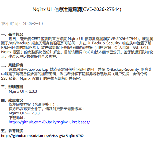 【安全预警】《Nginx UI 信息泄露漏洞(CVE-2026-27944)》