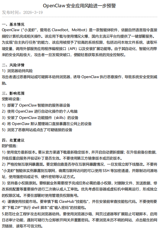 【重大】【安全预警】《OpenClaw安全应用风险进一步预警》